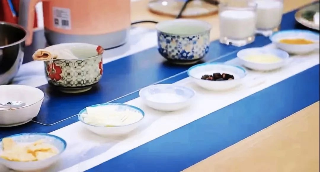 展示正式开始,童惜开始了她的“拿手好戏”。桌上,整齐地摆放着一碗碗:青砖茶、牛奶、炒米、牛肉干、黄油、奶皮子、奶豆腐,还有她口中制作内蒙古奶茶最重要的一个调料——盐。童惜开玩笑地跟我们说:“你在杭州的奶茶店里买奶茶,店员都会问你要几分甜呀?但是如果你到了内蒙古喝奶茶,店员就不是问你几分甜了,而是几分咸呀?哈哈。” 童惜开始一边制作一边向我们介绍着流程:“首先在沸水中加入青砖茶的茶包,大火煮沸约10分钟,这时茶的颜色已经完全释放出来,将茶包捞出。