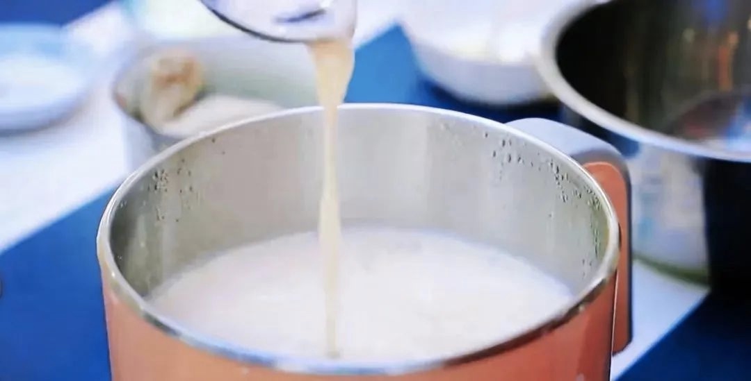 在茶汤中依次加入鲜牛奶、炒米、黄油、牛肉干和盐。 这时需用汤勺将奶茶不断捞起再慢慢倒回锅内,这个过程叫做‘扬沸’,它是熬制奶茶中很重要的一个过程,一方面可以让奶和茶充分地融合在一起,另一方面也会防止牛奶在高温沸腾中流失营养。最后再加入奶皮子和奶豆腐。(奶皮子和奶豆腐是用纯牛奶慢慢熬制,最上面的一层皮就是奶皮子,等牛奶熬制浓稠后,放凉成型就是奶豆腐,它们都是纯天然的奶制品。) 关火盖上锅盖,焖10分钟左右,这样一锅奶香浓郁,咸香可口,营养丰富的奶蒙古奶茶就做好了。”